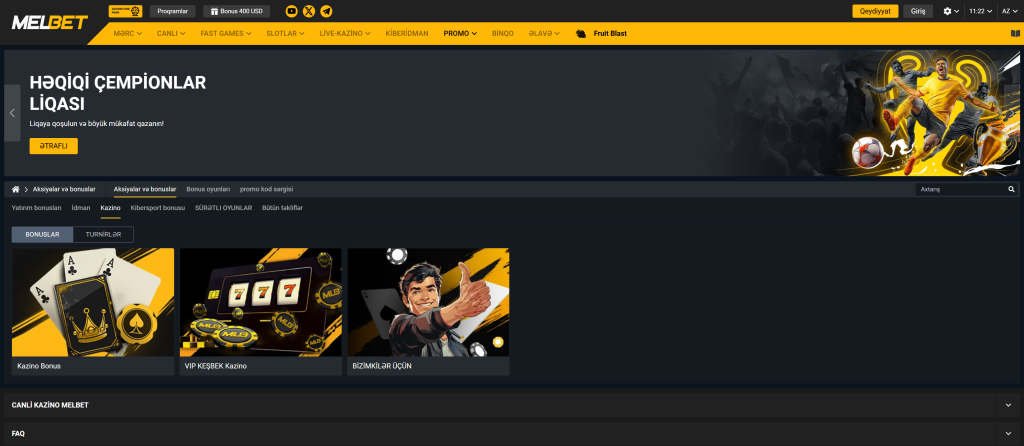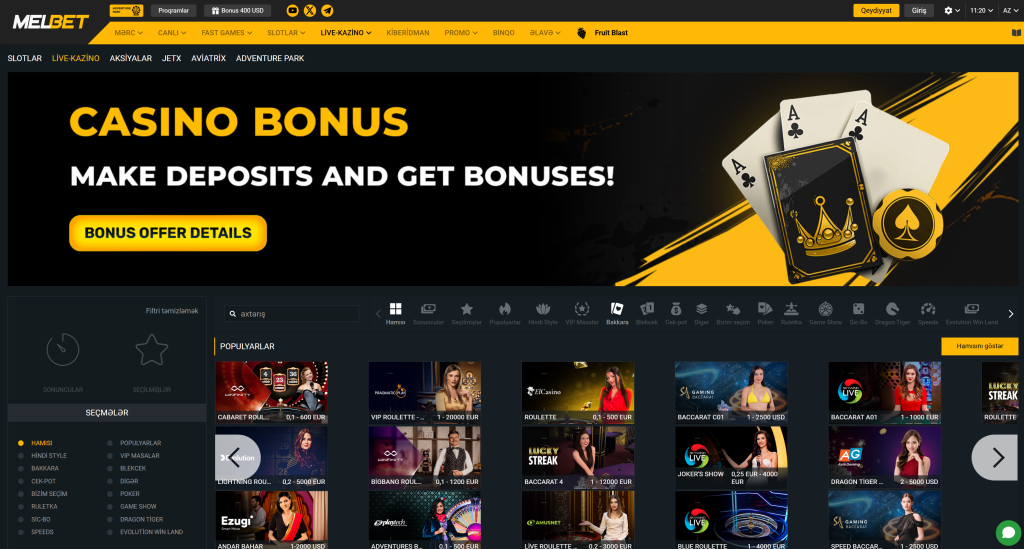 Azart oyunları oynamağı sevirsinizsə, Melbet kazino sizin üçün əla seçimdir. Burada hər şeyi tapa bilərsiniz: parlaq Melbet slotları – maraqlı və sadə oyunları sevənlər üçün. Əsl kazino həyəcanını yaşamaq üçün canlı dilerlə kazino live-oyunları. Real Money Games – Real pul üçün oynayaraq qazanmaq şansı. Və azart oyunlarının müxtəlifliyi istənilən üstünlükləri təmin edəcək – klassiklərdən tutmuş yenilikçi seçimlərə qədər.